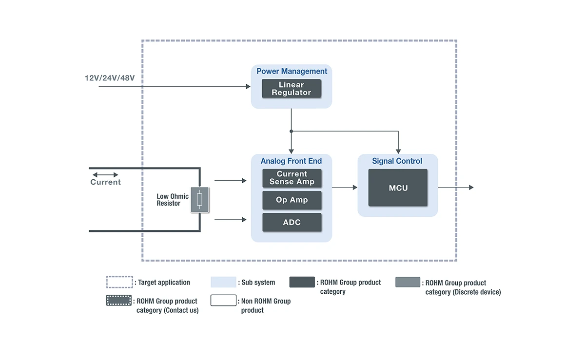 シャント抵抗の両端で生じる電圧降下を測定する電流センシング方式に対して、ロームは、高放熱シャント抵抗器や高精度電流センスアンプ、高精度オペアンプによる高精度な電流センシングソリューションを提供しています。