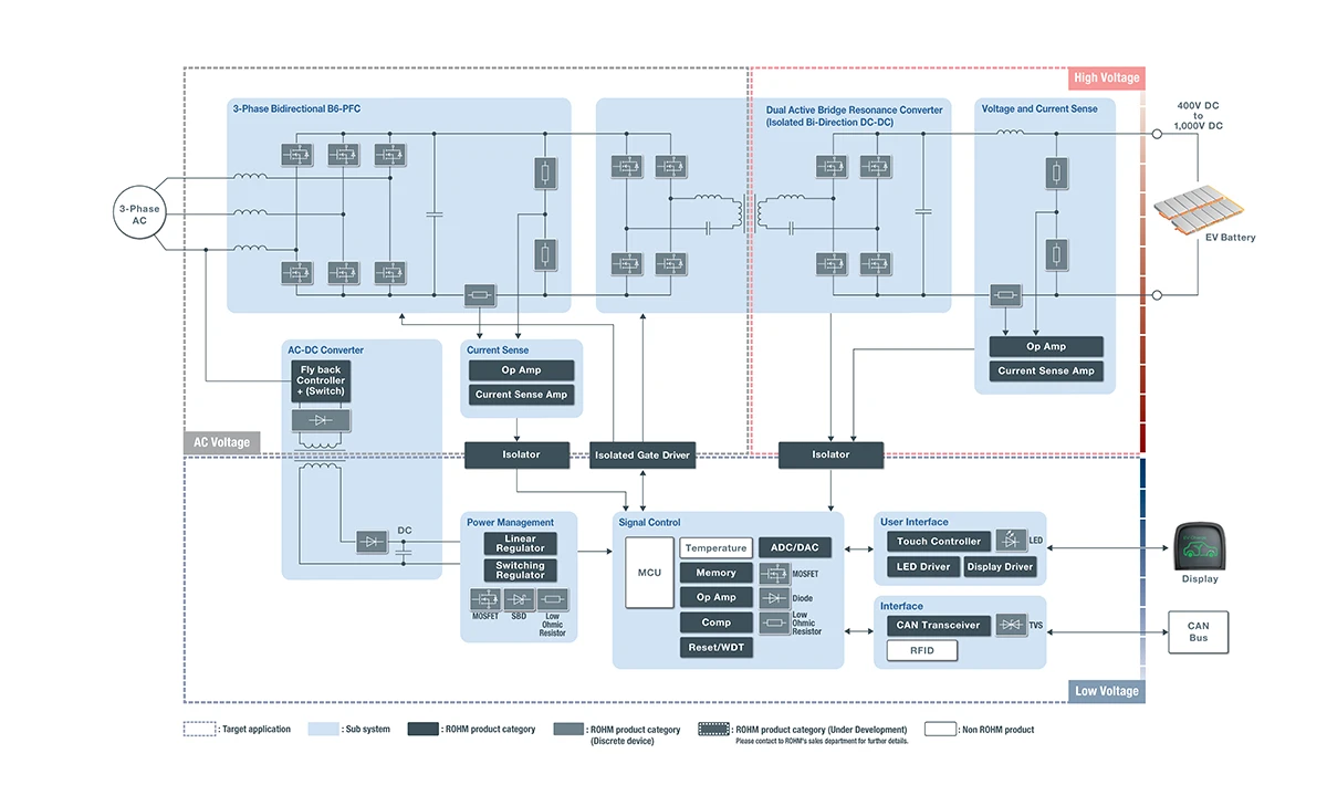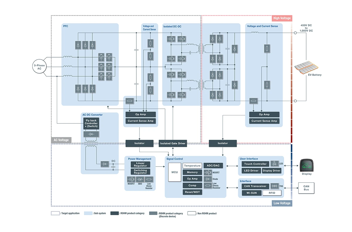 ロームは、SiCデバイスを中心とした各種パワー半導体と駆動ICによるパワーソリューションはもちろんのこと、シャント抵抗器と電流検出アンプによる高精度の電流検出により、さらなる充電の高効率化に貢献します。