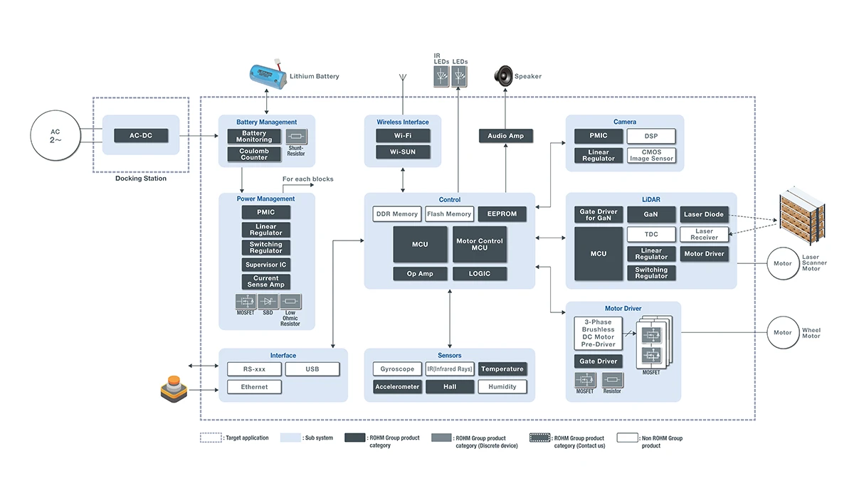 ロームは、高出力レーザーダイオードとGaN HEMTによるLiDARの長距離対応・高精度化ソリューションのほか、無線通信やセンサ、モータ駆動用製品を提供しており、AGVの自立走行性能向上とIoT連携構築に貢献します。