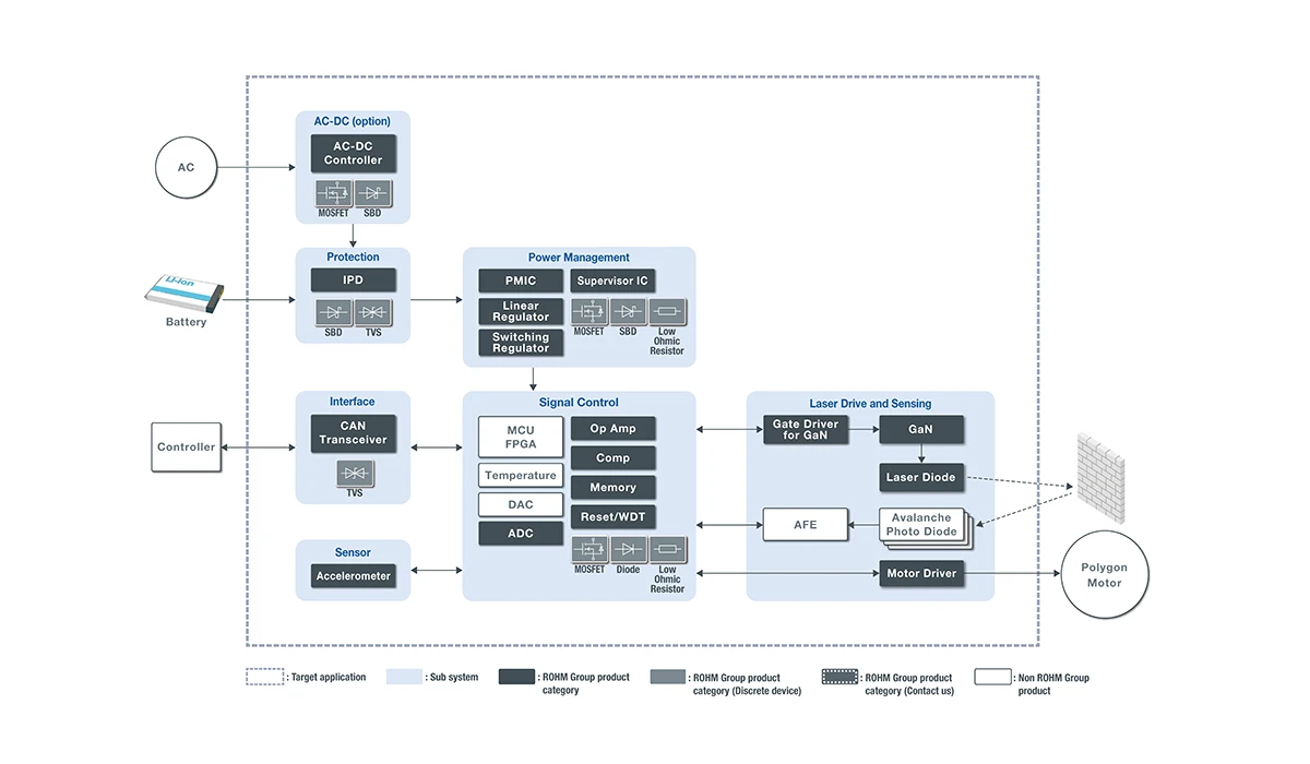 ロームは、高出力レーザーダイオードとGaN HEMTによるLiDARの長距離対応・高精度化ソリューションのほか、無線通信やセンサを組み合わせることで、産業機器のIoT技術向上に貢献します。