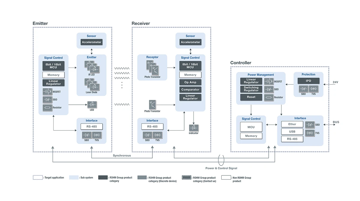 ロームは、外乱光に強いラインアップを持つフォトニクス製品のほか、電源ICや制御用MCUを提供し、作業者の安全性確保を通じて、安心・安全の働き方実現に貢献します。