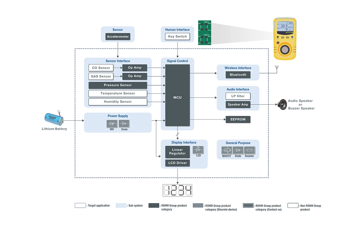 ガス漏れ検知器は、燃料用ガス漏れや不完全燃焼で生じた一酸化炭素(CO)など、有害ガスを検知して警報を発する装置であり、点検作業を安心して行うために高精度・高信頼性が必要とされます。同時に、警報内容を音声で通知したり、通信機能によりデータを蓄積することで異常予兆に活用するなど、人にやさしいインターフェースも求められます。